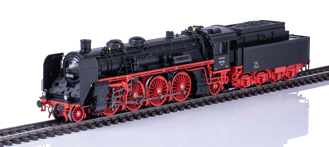 H0 (AC-S) Schlepptender-Dampflok BR 19 016 'Sachsenstolz' der DR, Ep. III, mit mfx/DCC-Geräusch-Decoder mit Pufferspeicher, Lok und Tender weitgehend aus Metall und Pufferhöhe nach NEM, Rauchentwickler mit dynamischem Rauchaustoß, LED-Beleuchtung (Spitzensignal, Führerstandsbeleuchtung und Feuerbüchsflackern) usw.