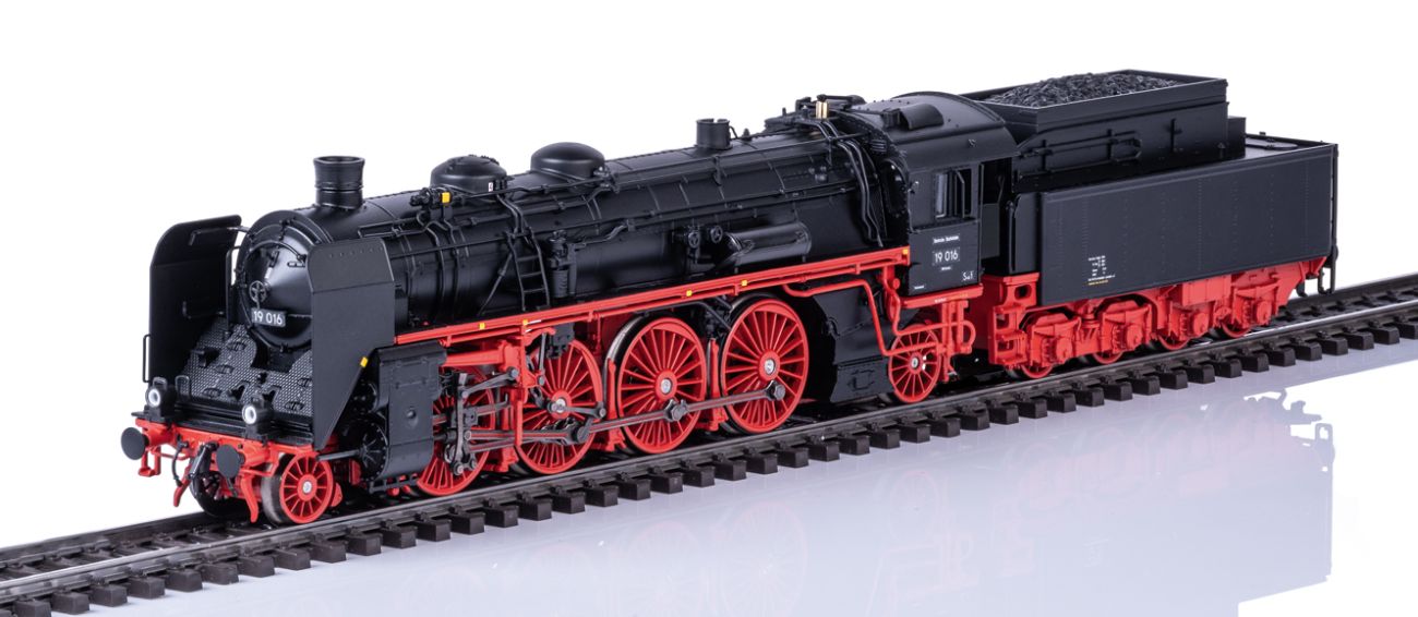H0 (DC-S) Schlepptender-Dampflok BR 19 016 'Sachsenstolz' der DR, Ep. III, mit DCC-Geräusch-Decoder mit Pufferspeicher, Lok und Tender weitgehend aus Metall und Pufferhöhe nach NEM, Rauchentwickler mit dynamischem Rauchaustoß, LED-Beleuchtung (Spitzensignal, Führerstandsbeleuchtung und Feuerbüchsflackern) usw.